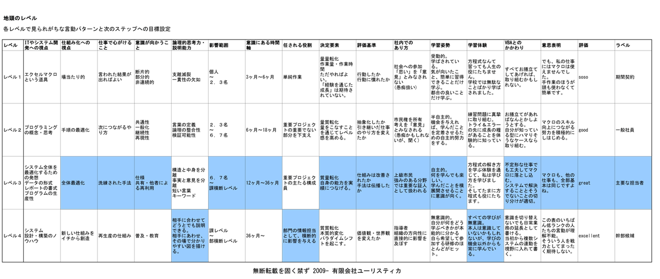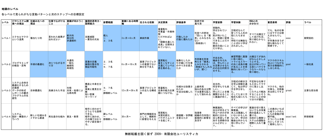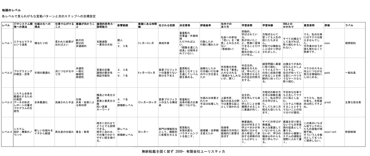 以下は、「地頭の良さ」それや関係する諸項目について、項目別にそのレベル感を表現したものです。