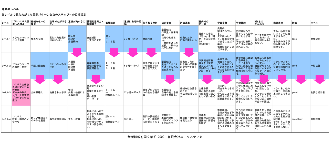 逆に、レベルの高い人は、エクセルマクロを学ぶとき、「プログラミングの概念について学ぼう」、「システム構築に必要な考え方のエッセンスを習得しよう」といった姿勢で学ぼうとします。