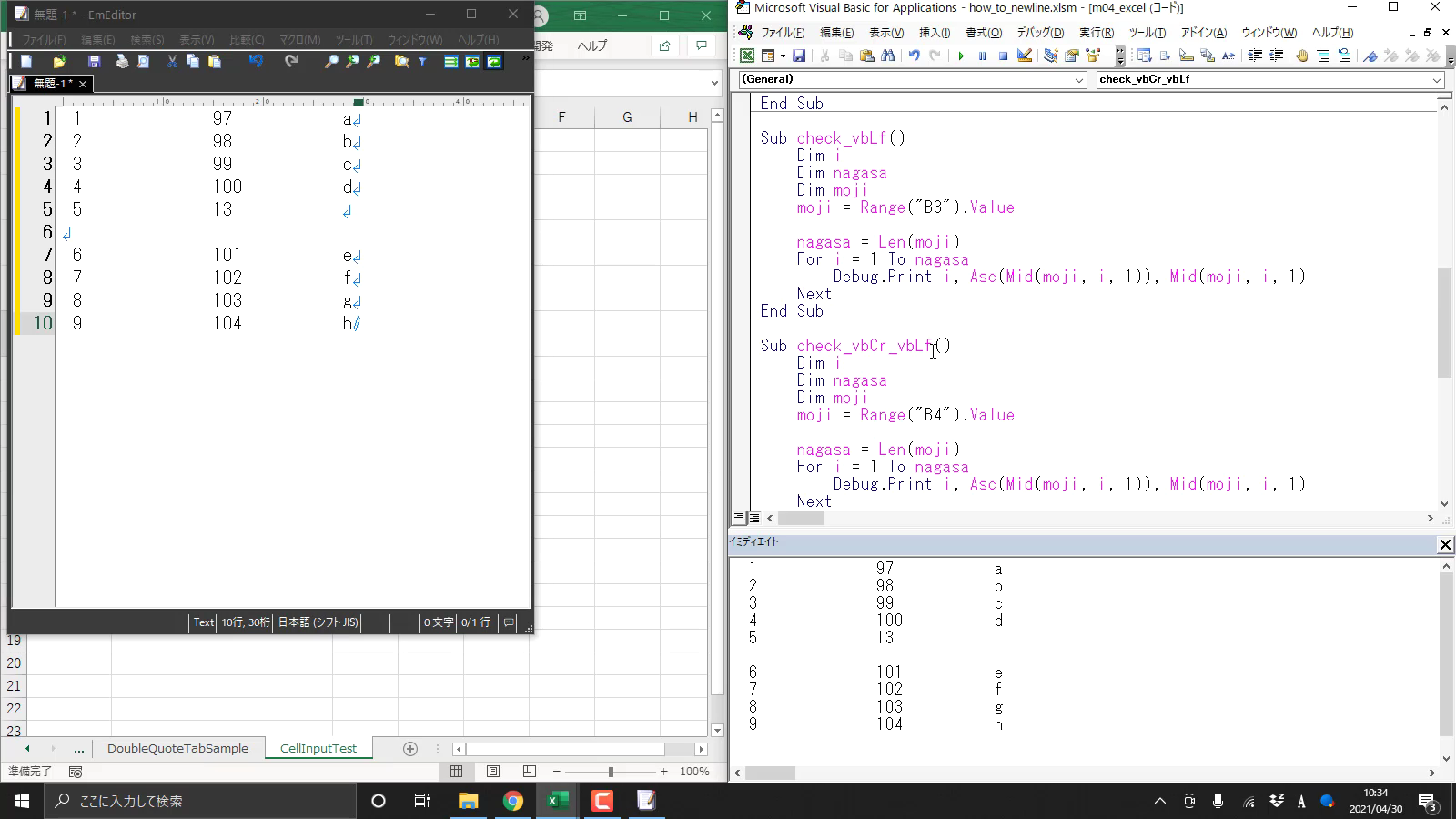 これらの挙動について、前の動画で示した結論のとおりになるか?エクセルセルへの出力、イミディエイトウィンドウへの出力、テキストファイルへの出力それぞれについて、サンプルコードを実行しつつ確認していきます。