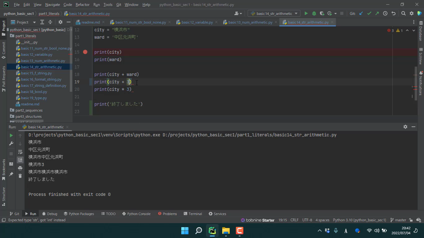 文字列の結合では、左辺も右辺も文字列型でなくてはななりません。