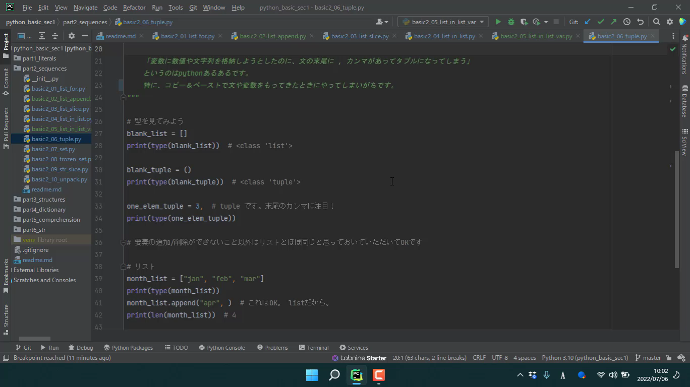 タプルは、「要素の追加/削除ができないリスト」のような性質を持ちます。