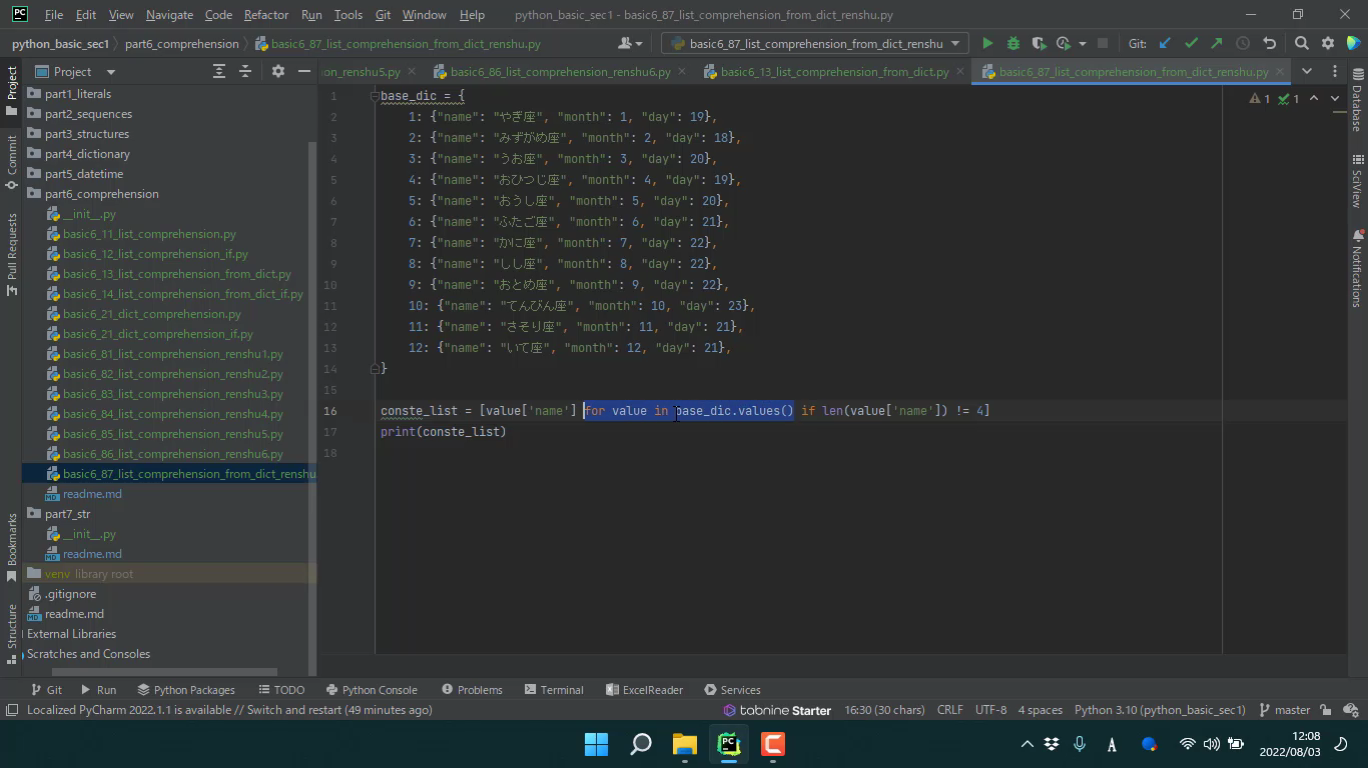 リスト内包表記の演習です。辞書を元にしてリストを生成します。