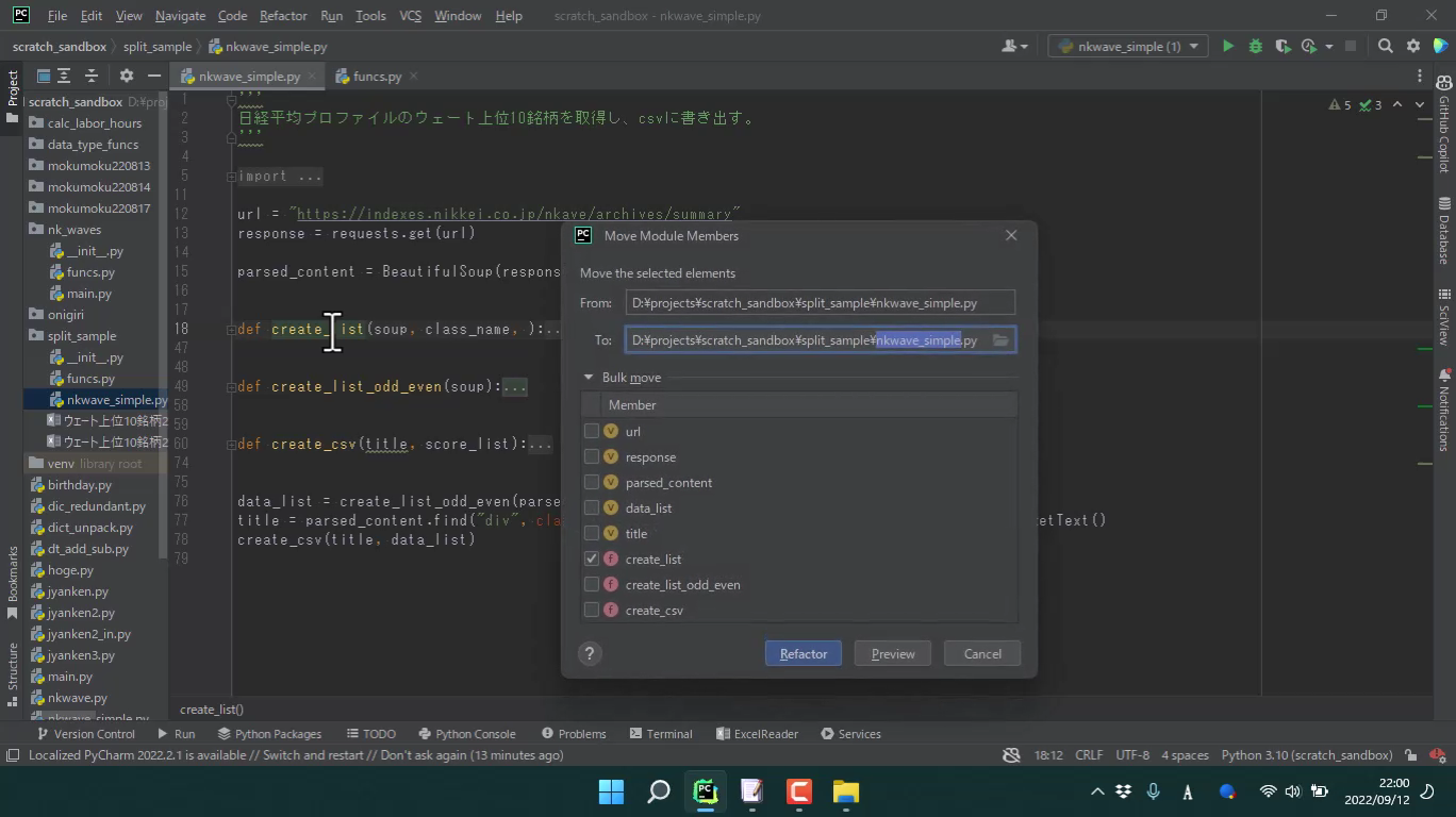 Pycharmでの、[Refactor] -> [Move] の機能を紹介します。