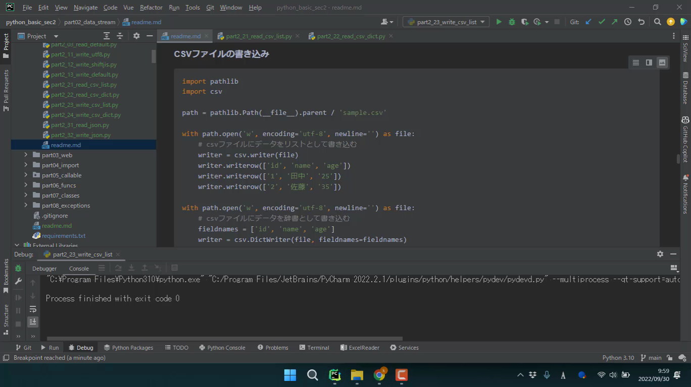 csv.writer, csv.DictWriter を自由に使い分けられるようになりましょう。