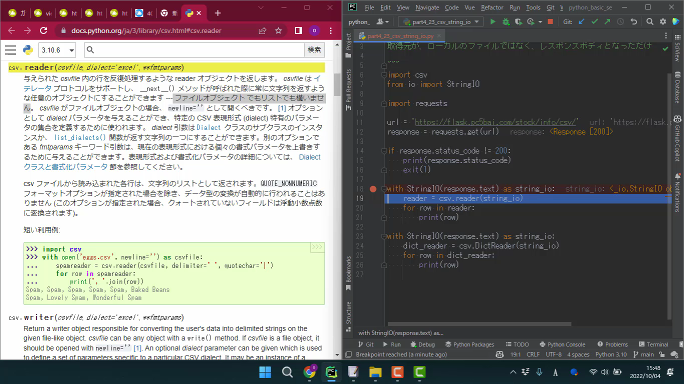 csv.reader や csv.DictReaderの仕様上の事情から、 jsonデータの取得やhtmlファイルの解析のときと比べて、ちょっと処理が複雑です。