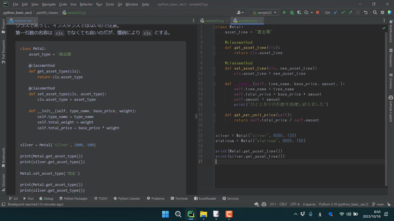 @classmethod というデコレータを使用します。また、仮引数の第一引数が cls になります。