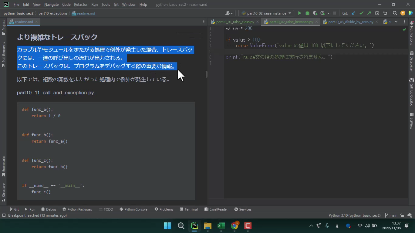 例外発生時のトレースバックの読み方について学びます。