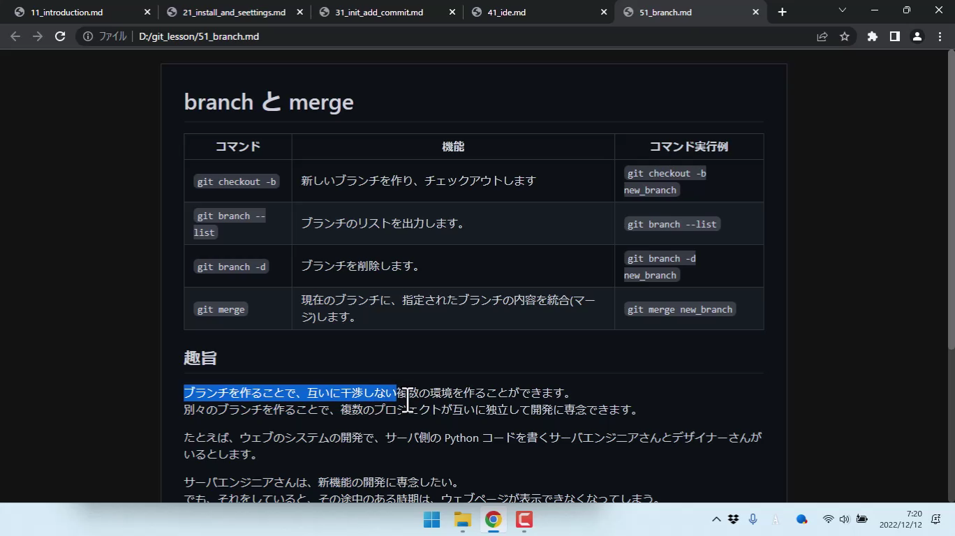 以下のコマンドを使いつつ、最低限のバージョン管理の方法について学びます。
