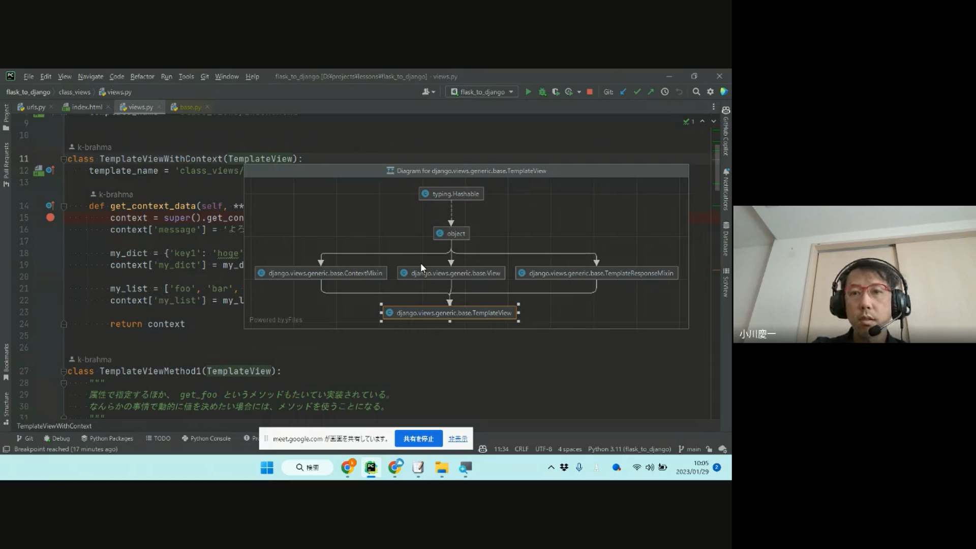 ccbv, Pycharm の諸機能を使ってクラスの依存関係や定義されている属性を参照する方法を学びます。