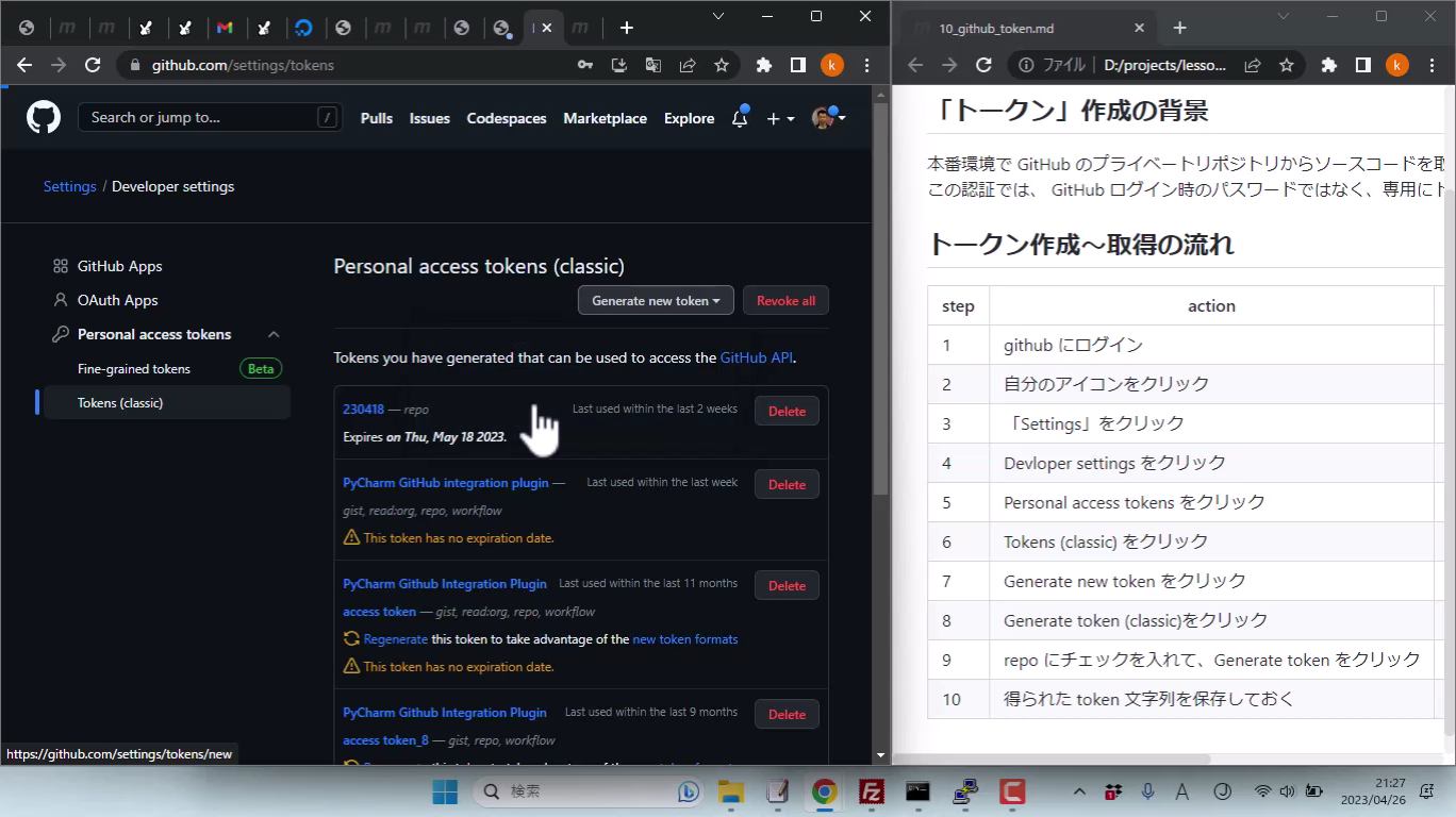 アクセストークンは、ユーザ設定の済んでいない Linux サーバ内の git からプライベートリポジトリに接続する時などに必要になります。