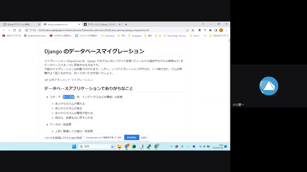 Django以前の知識としてのデータベースのマイグレーションについて主に解説しました。