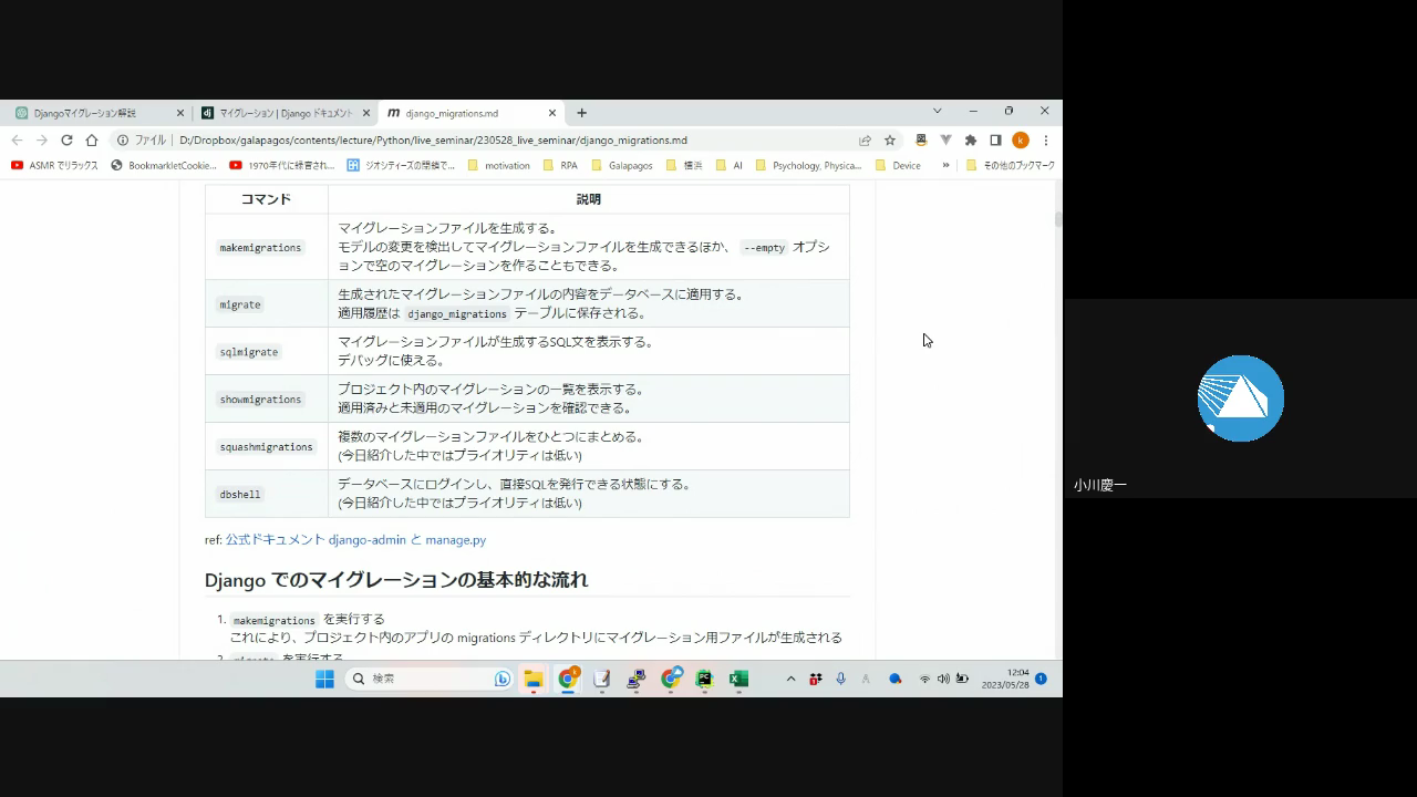 本日のゼミの締めとしての、Djangoでのマイグレーションにかかる質疑応答とチェックアウト。