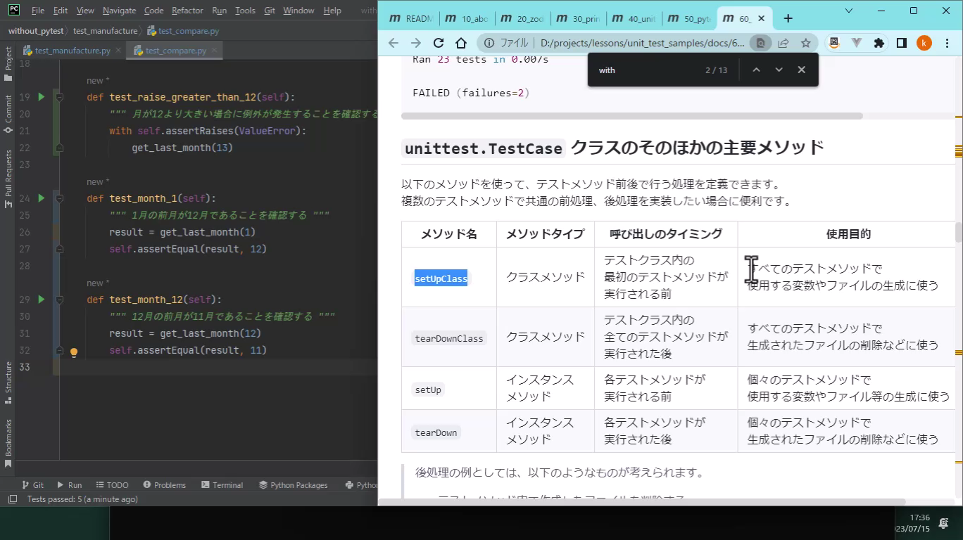 Python標準の unittest での例外のテストと、 setUp 等のビルトインメソッド
