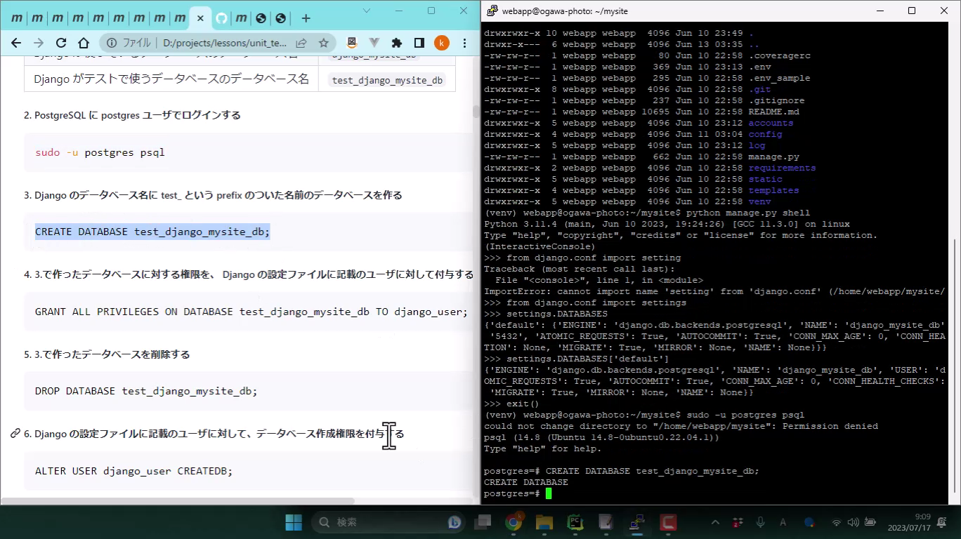 Djangoでのユニットテスト-サーバでのテストデータベースにかかわる権限の設定