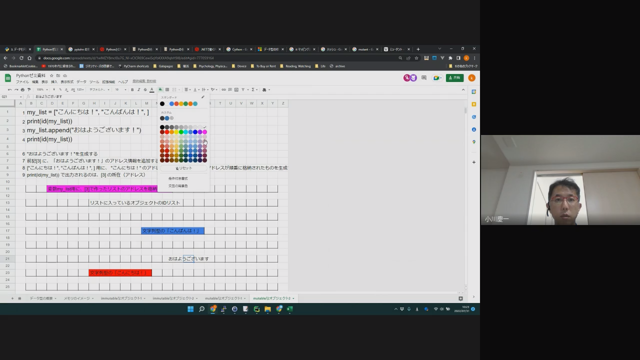 では、「リストや辞書の内容が更新されるとき、Pythonはメモリ上でどのような操作をしているのか」というところについて、メモリのイメージのイラスト等を使いながら説明しています。