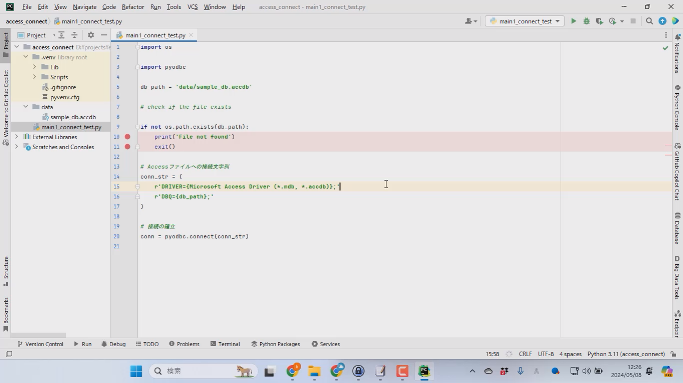 AccessデータベースにPythonから接続するには、pyodbcを使います。