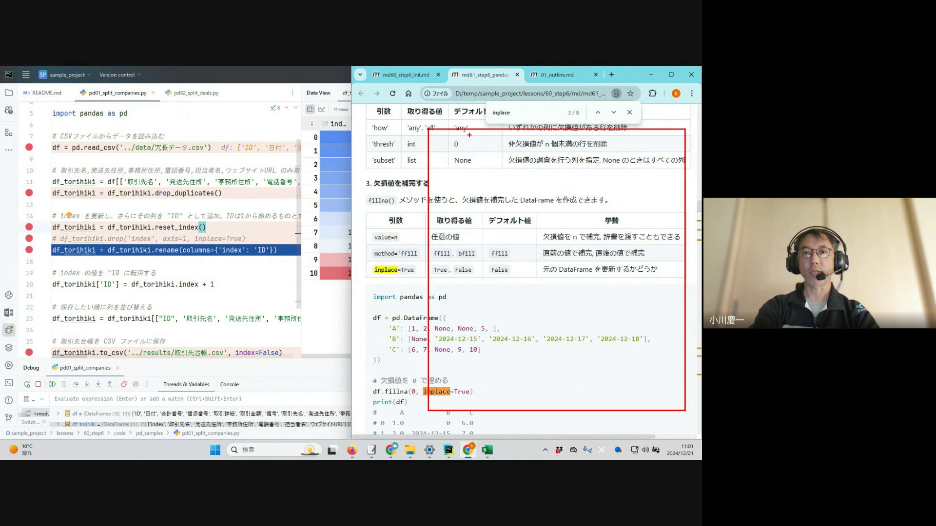 同様の作業ができるよう、同じデータで練習しておくと良いでしょう。途中の状況が理解しがたい場合は、都度都度 to_csv 等で途中経過の状態を保存しつつ作業してみてください。