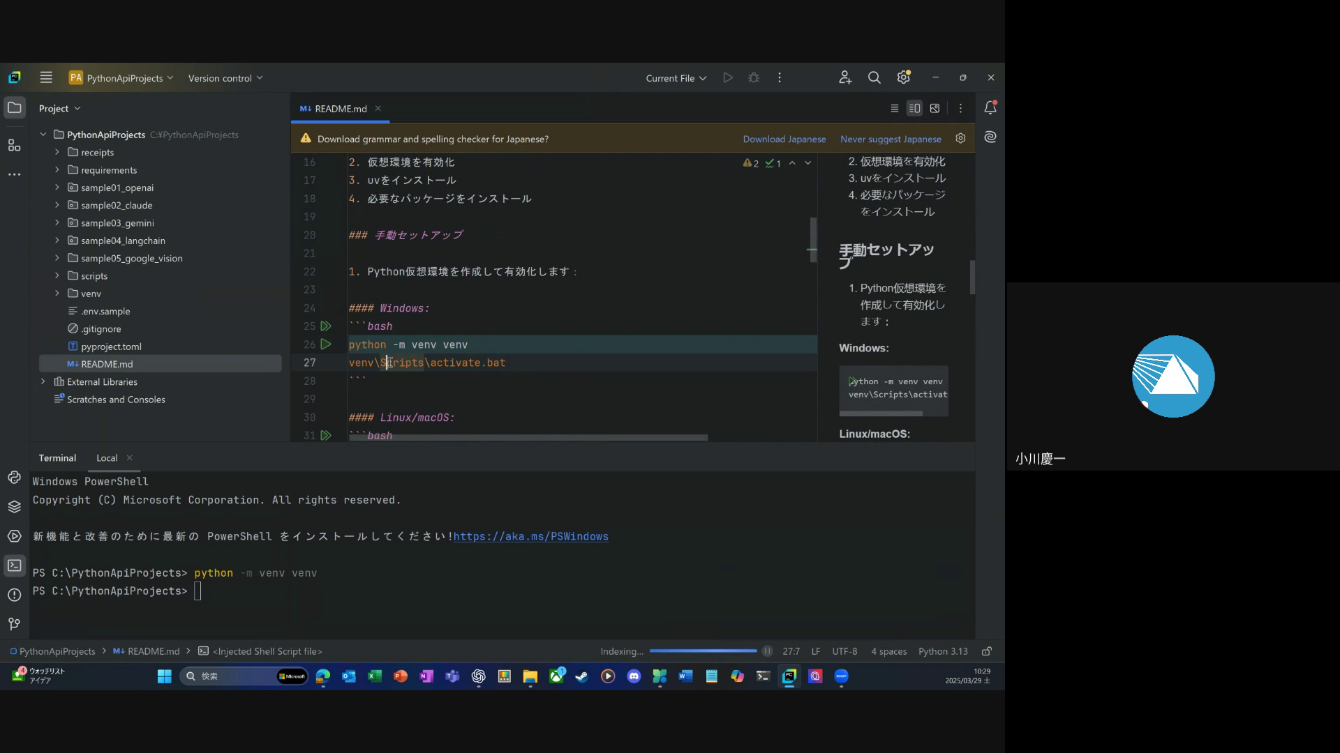 Pycharmで見ているフォルダが、プロジェクトよりひとつ上です。