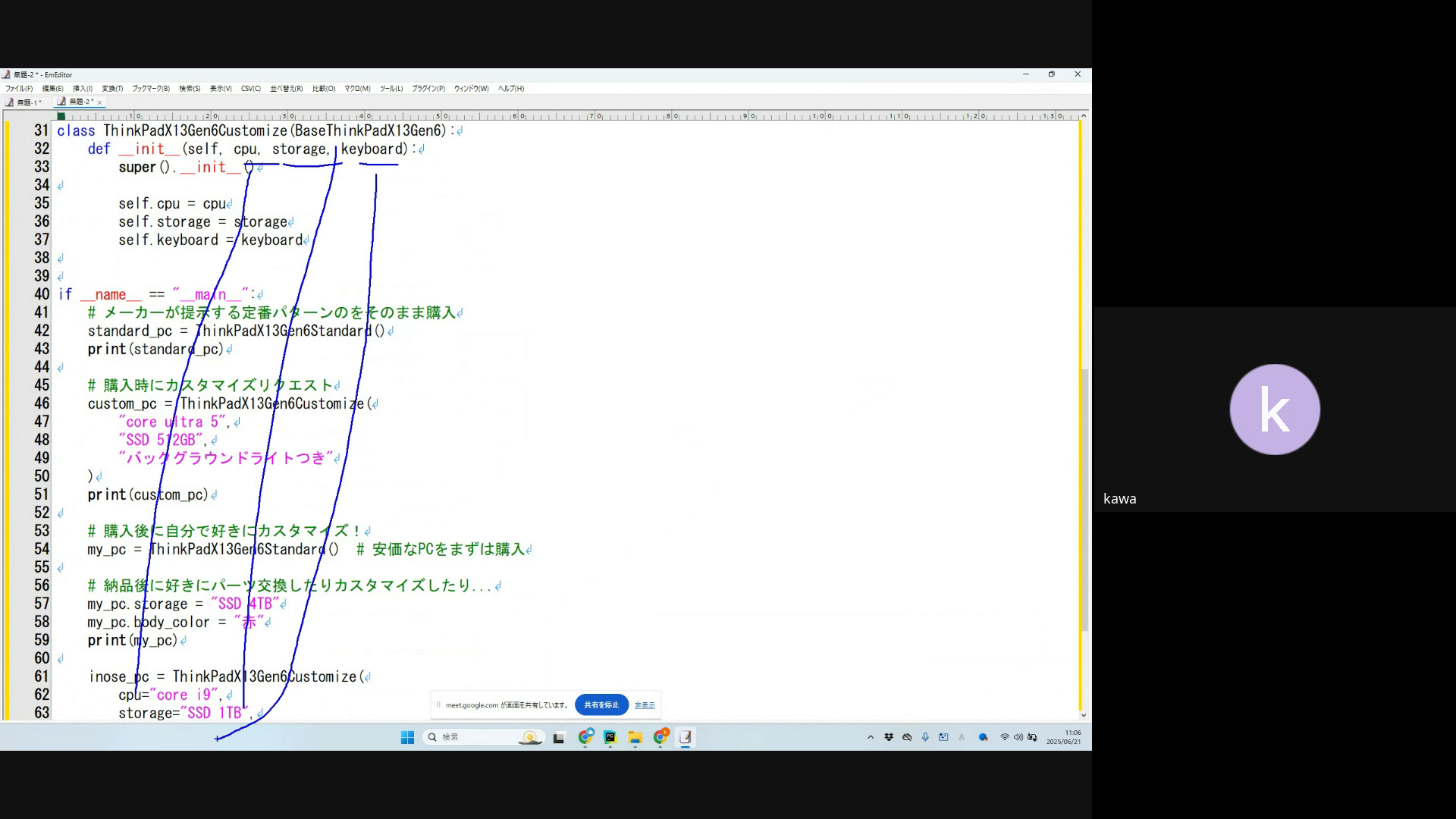 ひきつづき学習状についての報告で「クラスの継承」について理解を深めたいという話がありました。
