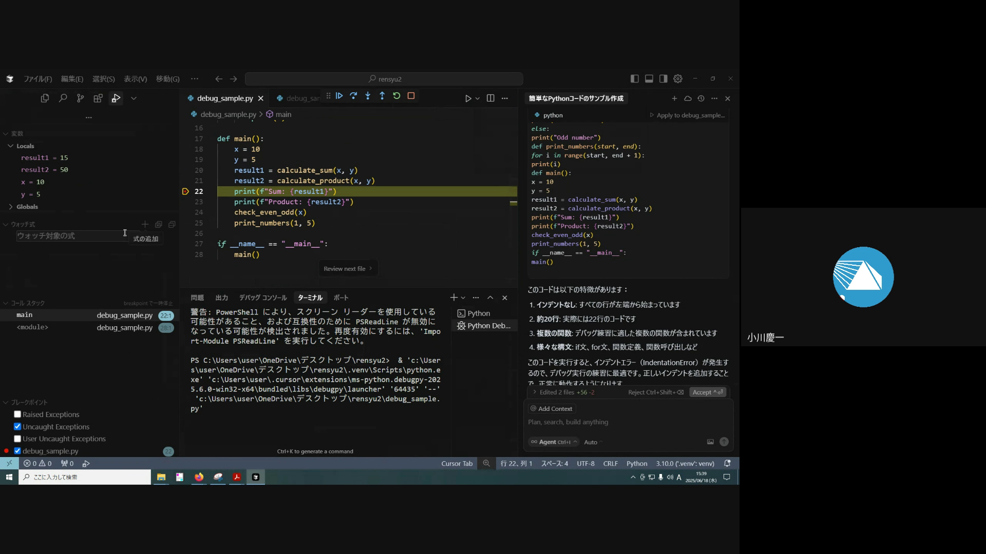 ステップ実行やブレークポイントの設定方法、変数の確認方法、ウォッチ式の利用方法などを実演します。