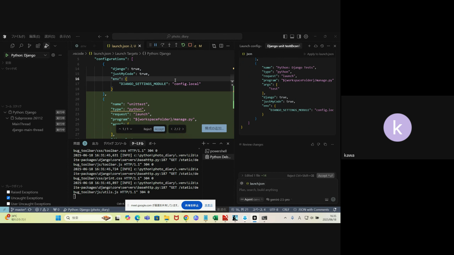 Djangoプロジェクトでのlaunch.json設定の実演