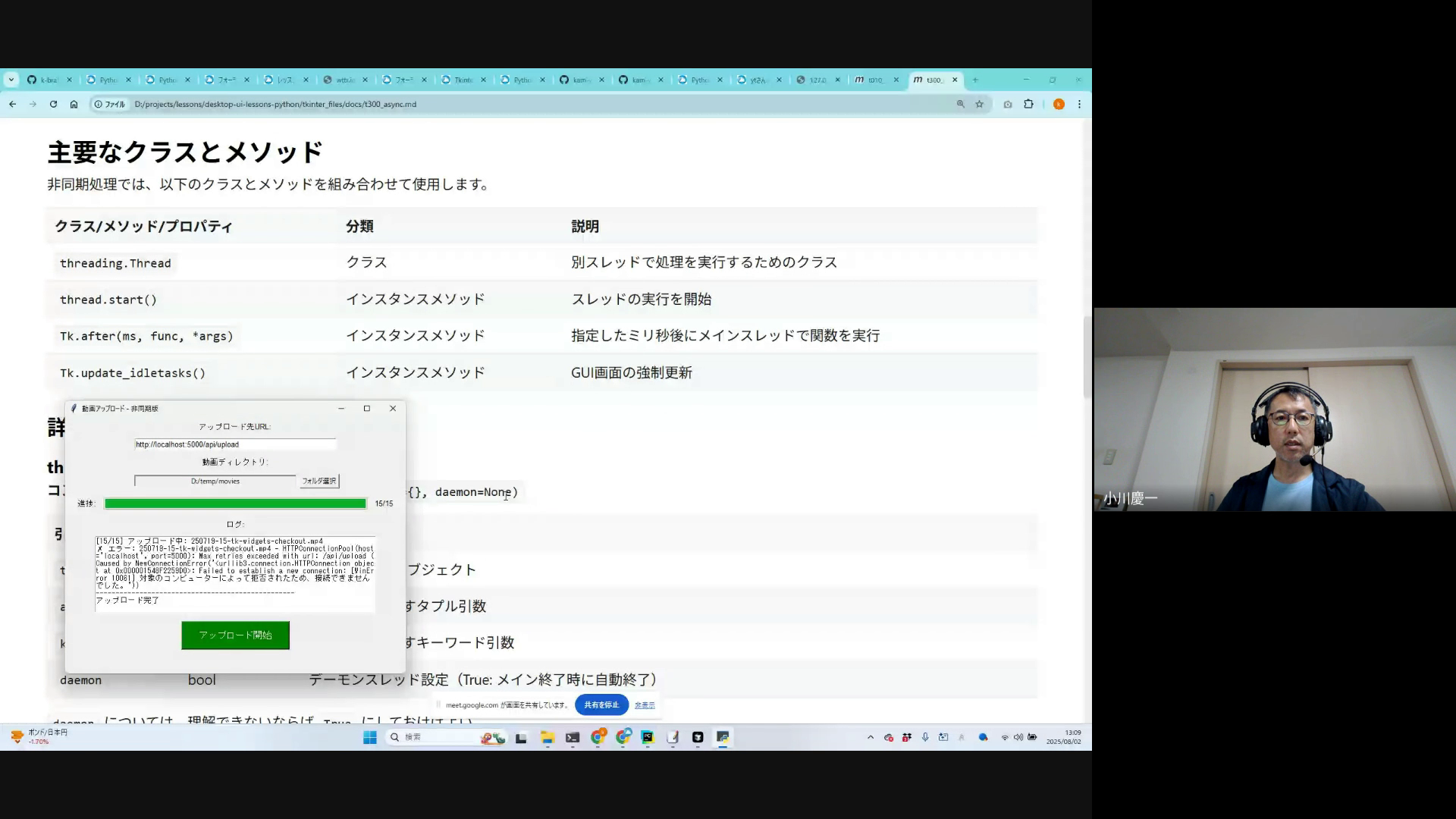 各受講生の感想共有と理解度確認。宿題として既存アプリのスレッド化を提案。次回講座の日程調整と、放課後サポートの案内で講座終了。