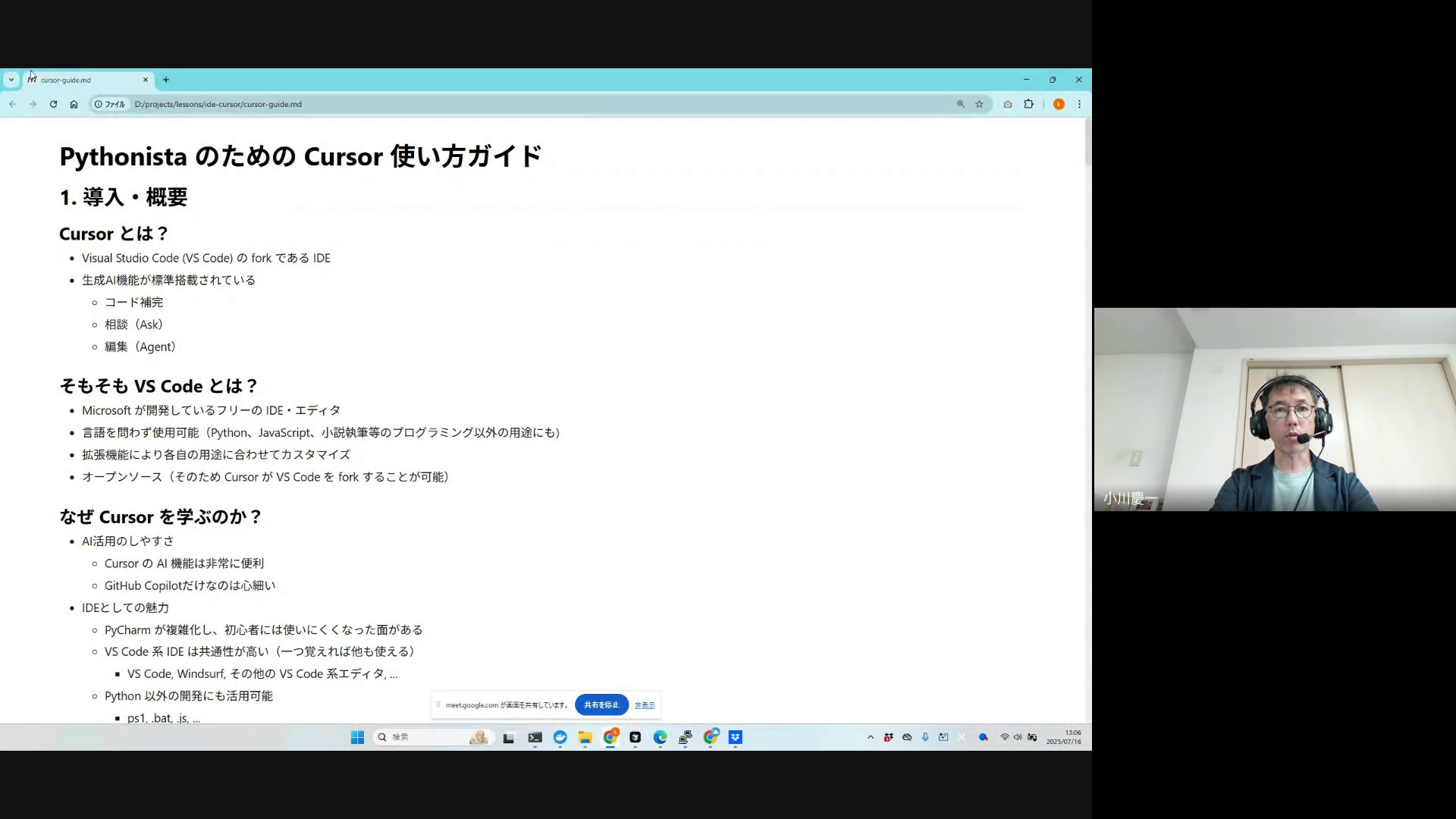 レジュメの配布(PDF版とマークダウン版)を行い、マークダウン形式について詳しく説明。マークダウンビューアの拡張機能の紹介も含む。