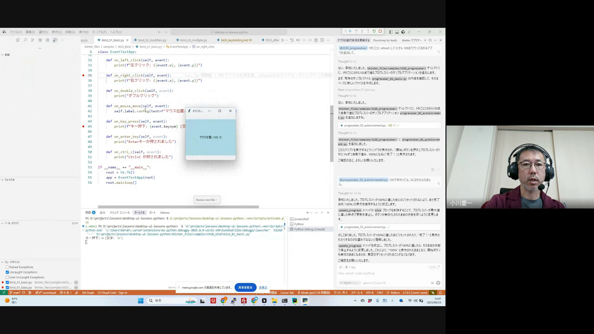 イベント文字列の定義方法、バインドの基本的な書き方とイベント引数の説明