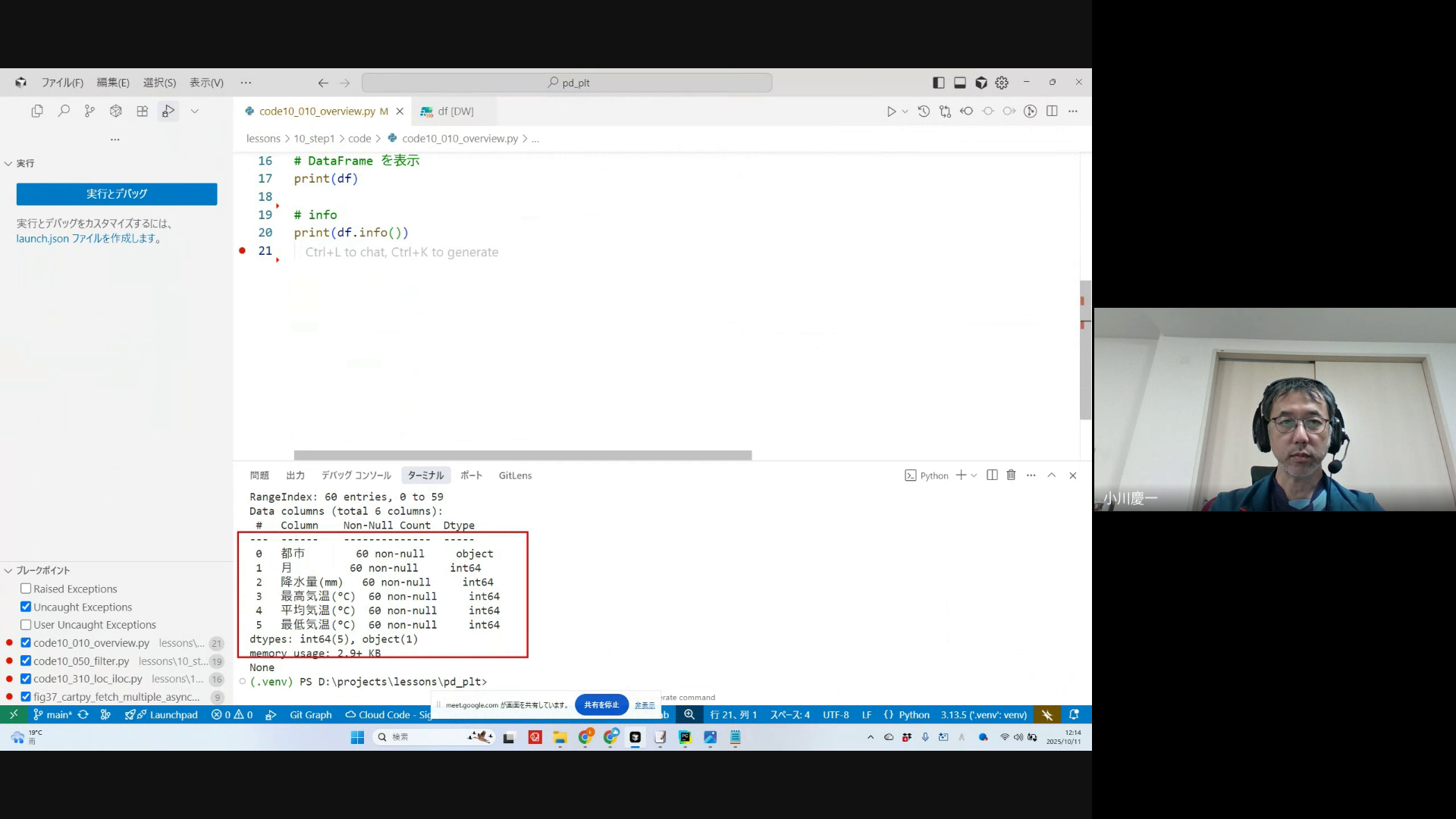 head、tail、info、shapeメソッドの使い方、データの基本統計量の確認