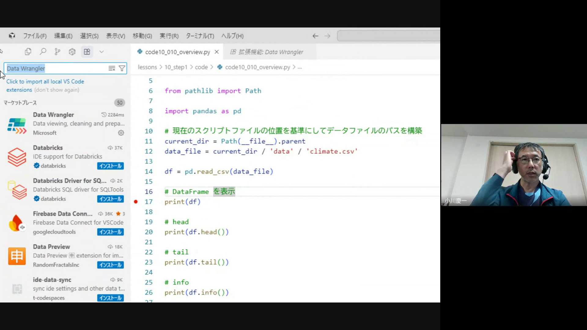 ブレイクポイントの設定、デバッグ実行の方法、開発環境での操作練習。VSCode/Cursorのおすすめプラグイン「Data Wrangler」の紹介。