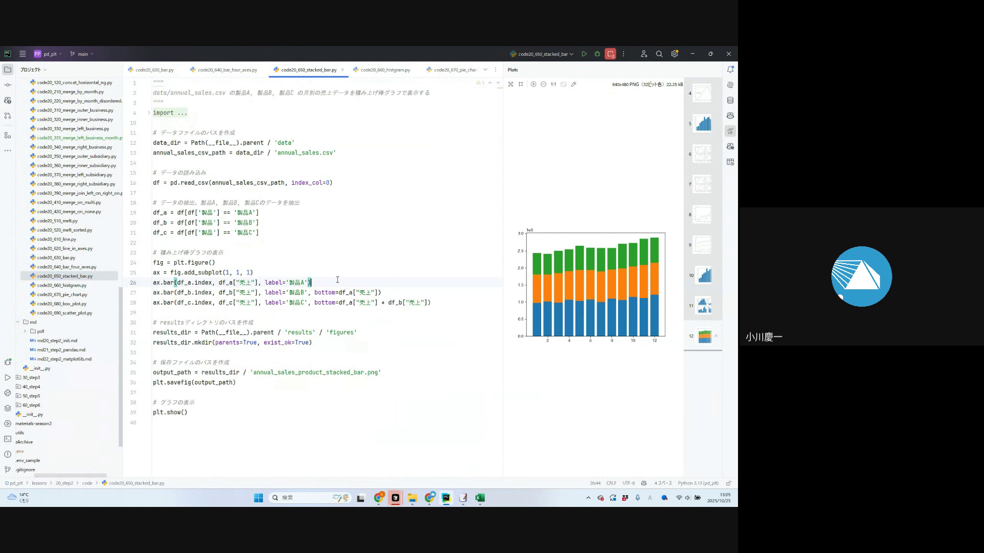 折れ線グラフ、棒グラフ、積み上げ棒グラフ、ヒストグラム、円グラフ、ボックスプロット等の作成実習と各グラフの特徴説明