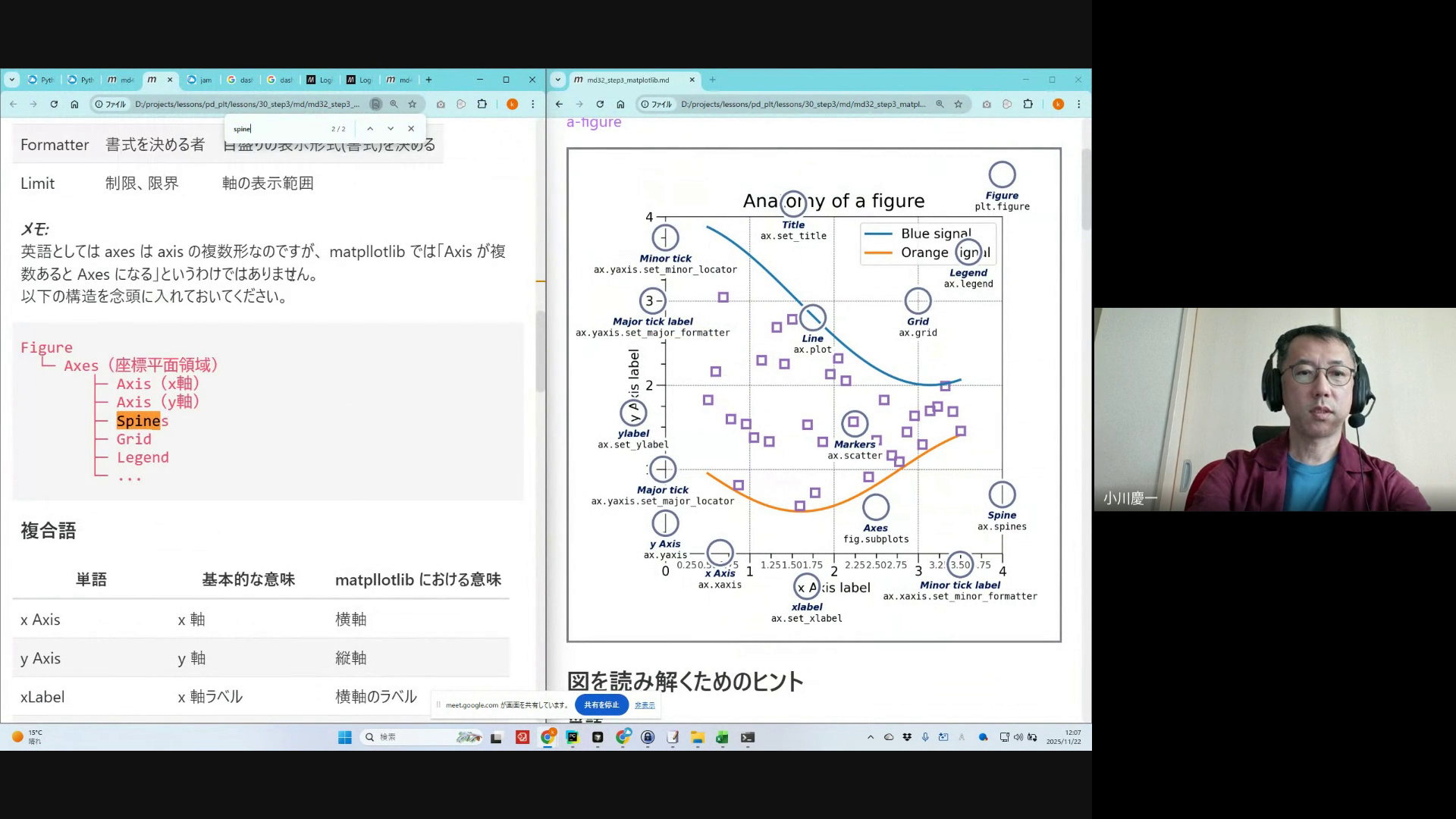 Matplotlibの基本構造(Figure、Axes、Plot)の説明と、スパイン、ラベル、グリッド、フォーマッターなどの基本用語の紹介。実際のデモを通じてグラフのカスタマイズ方法を学習。