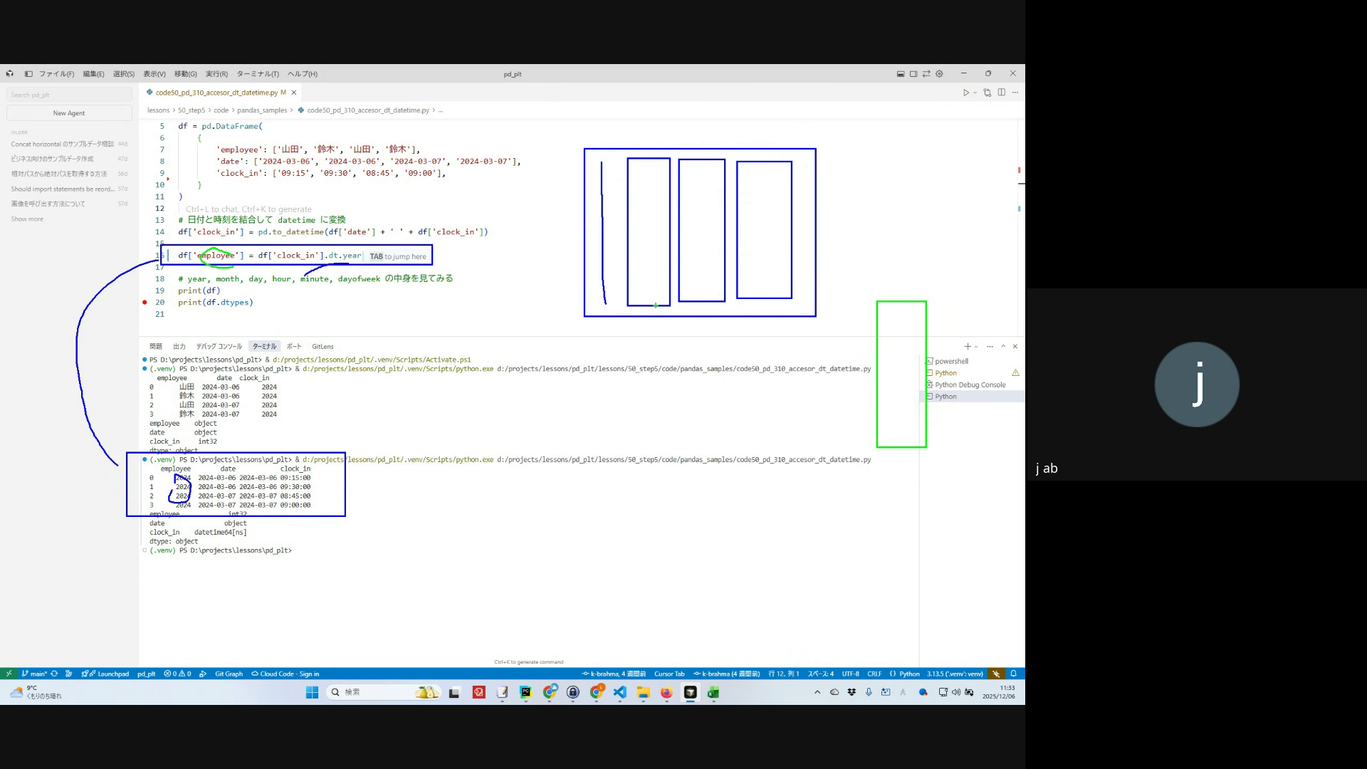 dtアクセッサー、lower、upper、strip、replace、contains、lenなどのストリングアクセッサーメソッドの実習