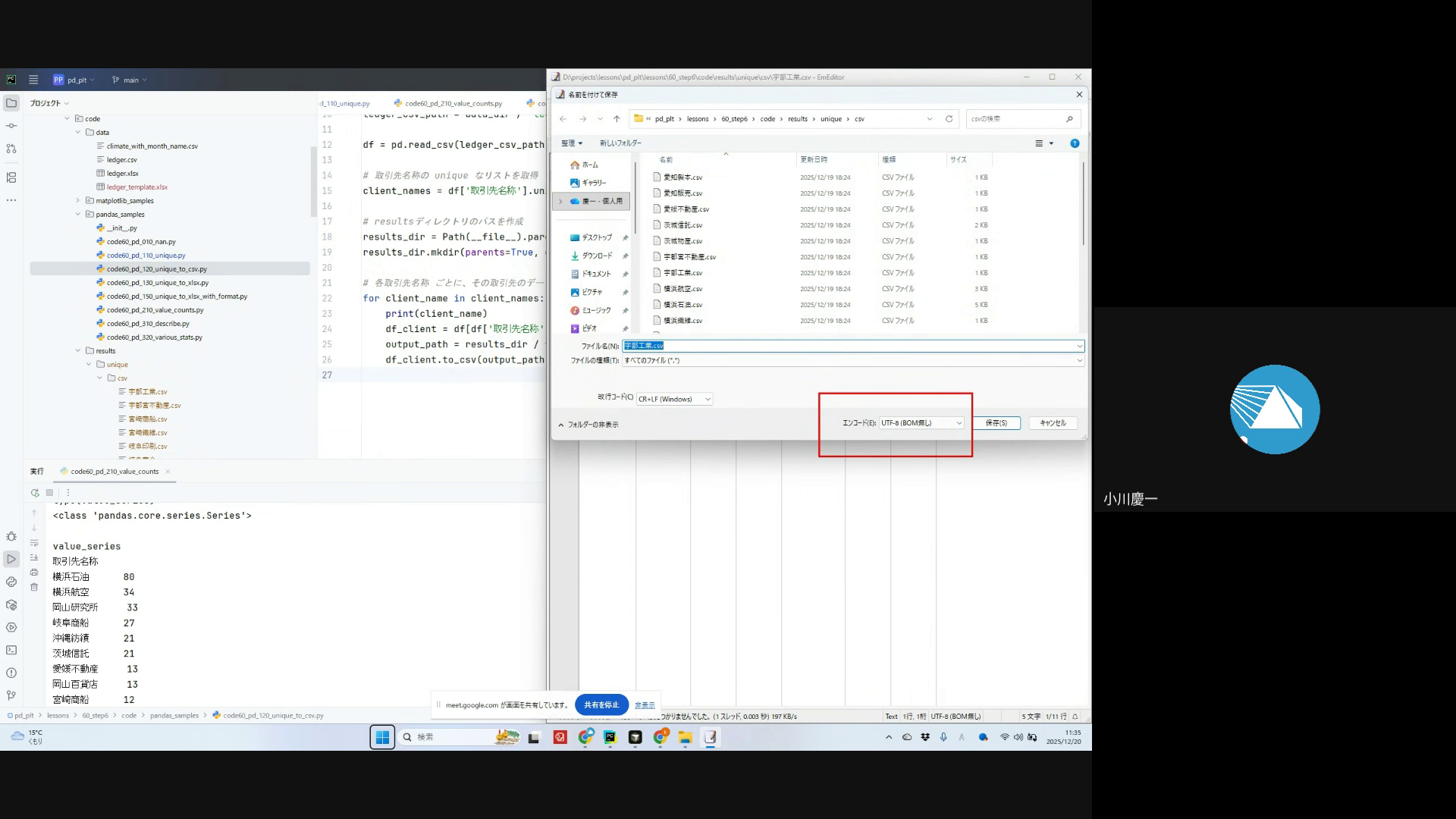 休憩後の画面共有設定から、CSVファイルの文字化け問題とExcelでの読み込み方法、UTF-8エンコーディングについての説明まで