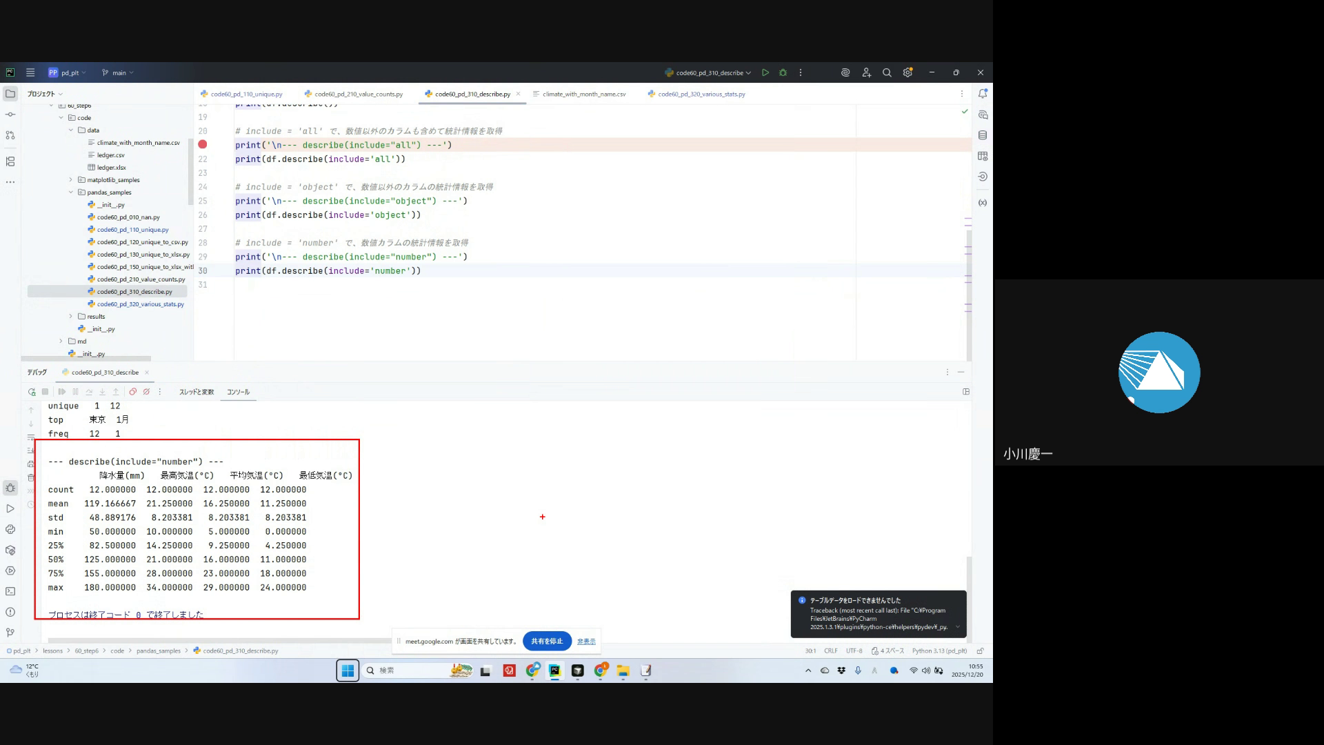 unique、value_counts、count、sum、mean等の基本的な集計メソッドの実習と説明