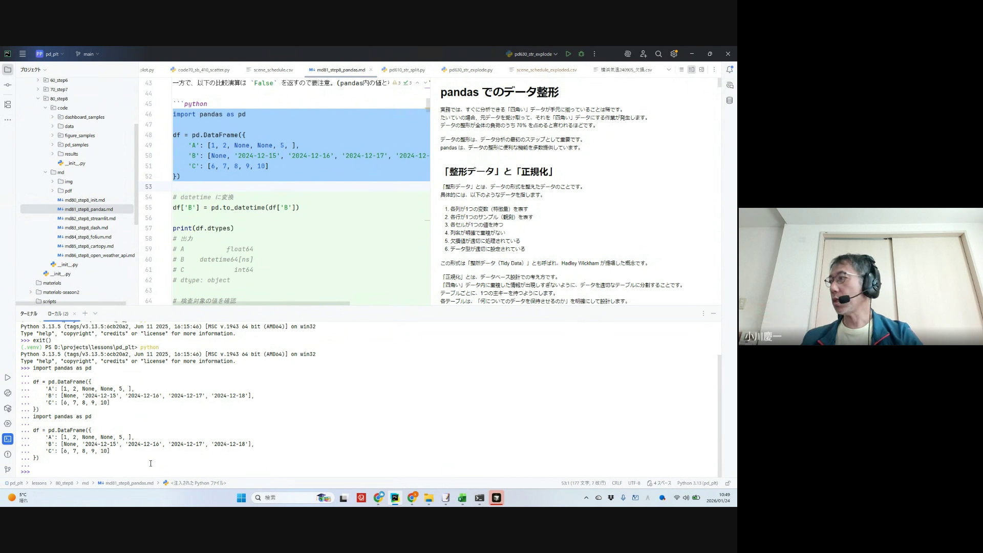 第8回講座の概要説明、整形データ(Tidy Data)の概念、欠損値の扱い方、NaNとNaTの説明
