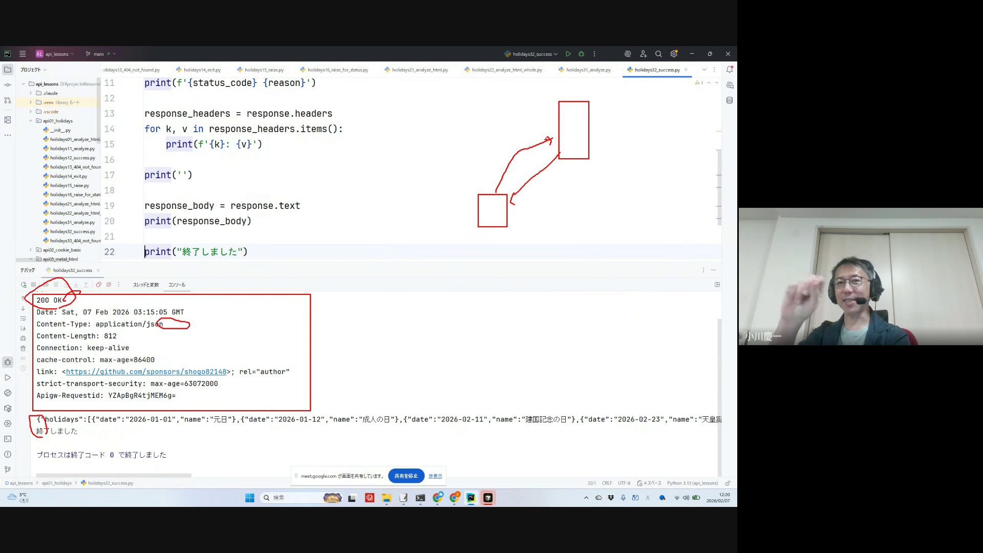 ブレイクポイントを使った実行方法の説明、ステータスコードやレスポンスヘッダーの確認、参加者からの質問への回答