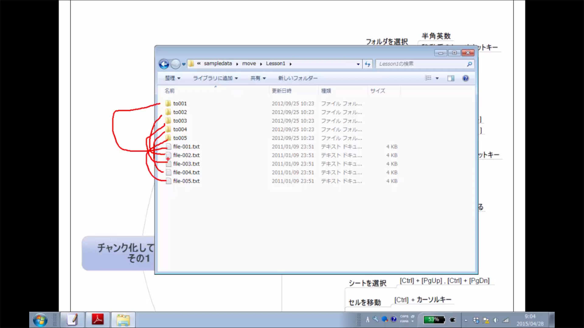 ファイル操作の練習です。ファイル名の先頭一文字目を入力してファイルを選択する、コピー、切り取り、貼り付け等の基本操作をショートカットキーで行う。