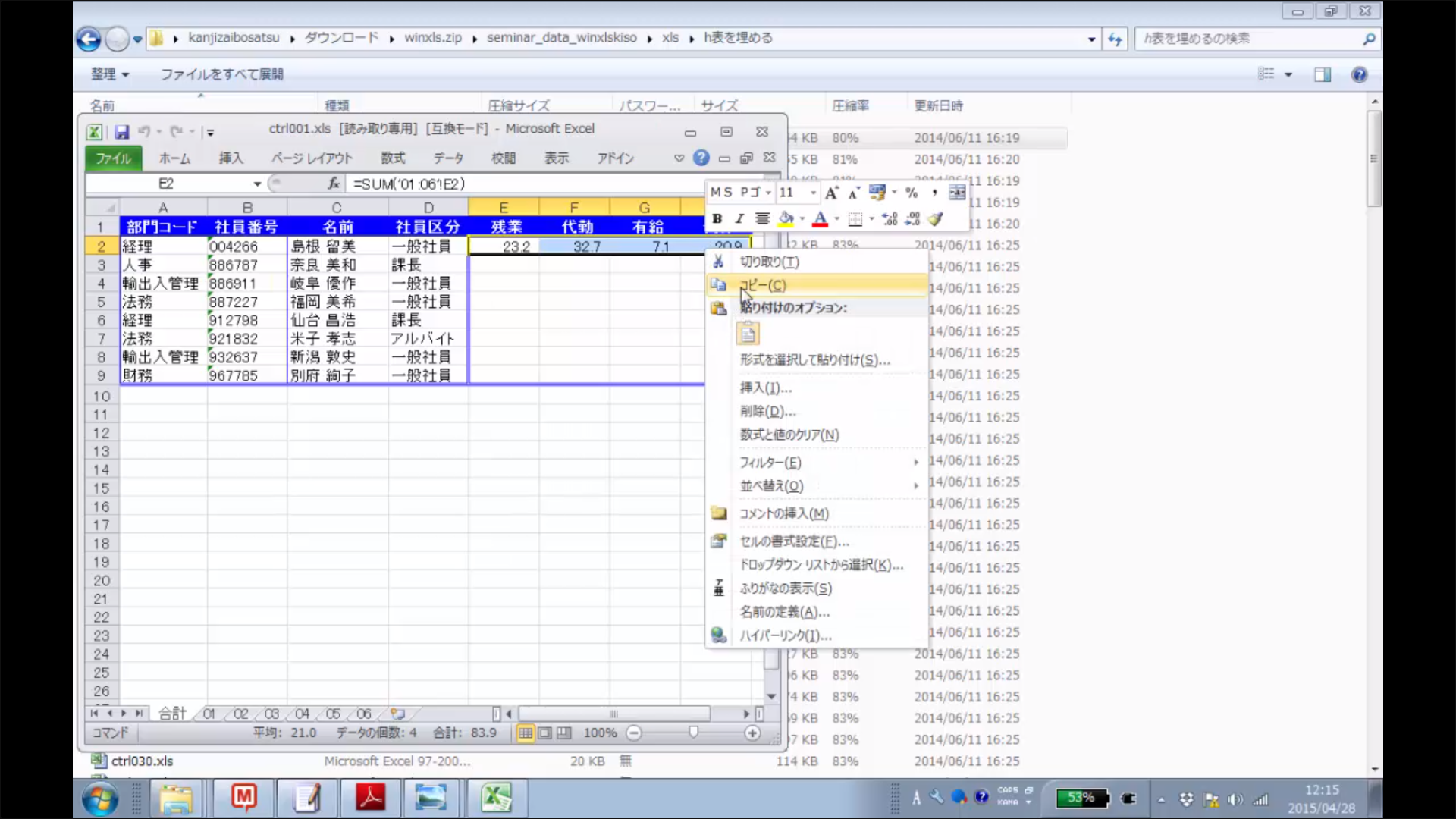 エクセルでのワークその1です。その1とあわせて、エクセルで使えると便利なショートカットキーを一気に習得します。ダイアログ操作についてもその基本をマスターします。