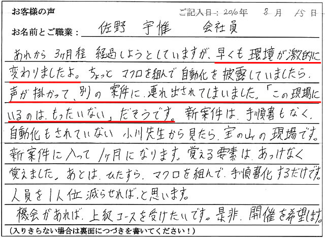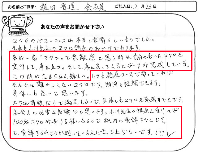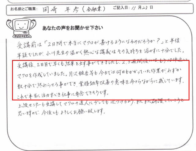 「受講前は『本当にマクロが書けるようになるのだろうか?』と半信半疑でした。