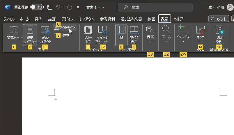 ここで、リボンの [表示] から [印刷レイアウト] が選択されていることを確認してください。