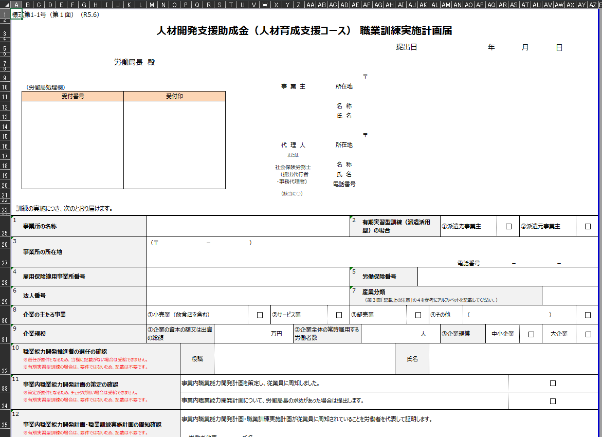 以下は一例です。最近話題の「リスキリング助成金」の申請書類です。